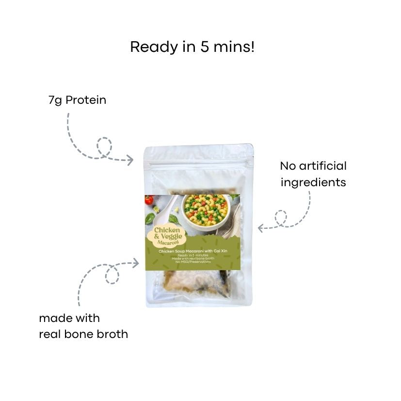 A comforting chicken soup macaroni made with real chicken bone broth powder and simple ingredients — ready in just 5 minutes.