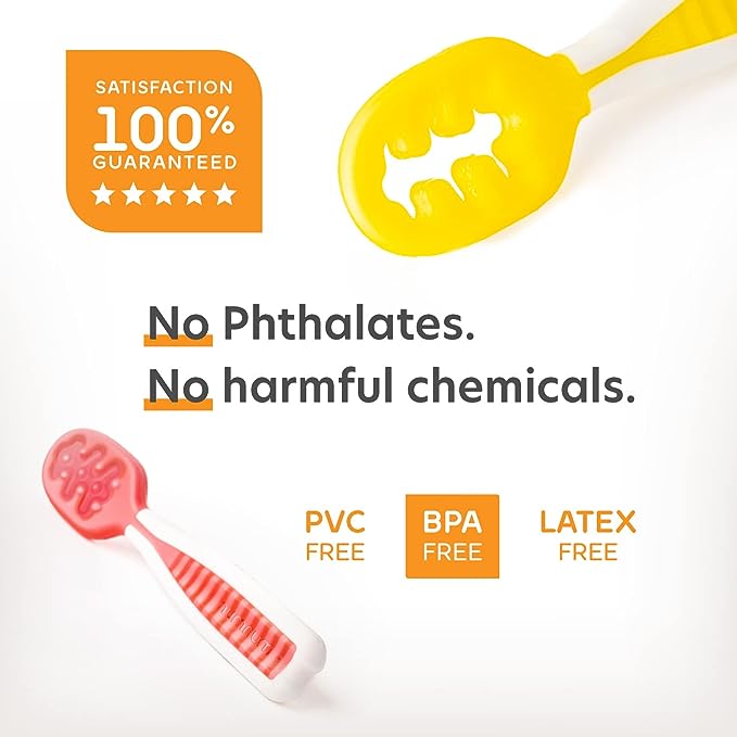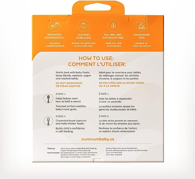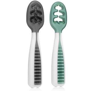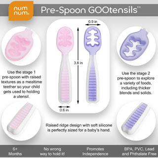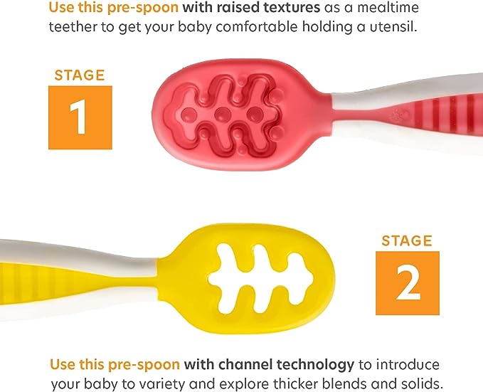 Introduce stage one pre-spoon (with raised textures) first so child can soothe their sore gums as they are getting acclimated to holding the utensil. Once the child has learned the basic food-to-mouth motion, the stage two pre-spoon, which holds more food, can be used interchangeably for thicker foods.