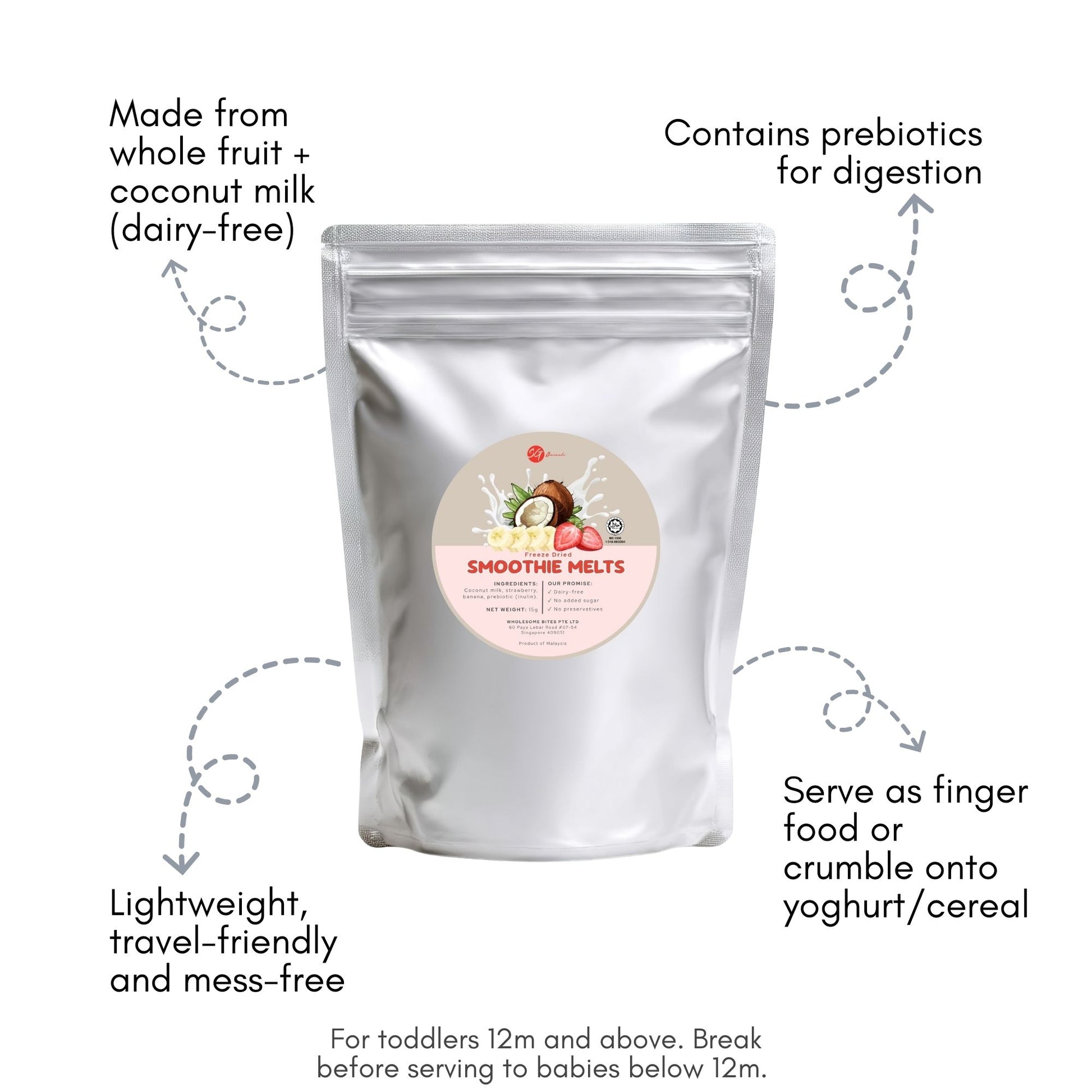 Smoothie Melts are freeze-dried, dairy-free smoothie bites made from real coconut milk, banana and strawberry — with a gentle prebiotic to help support little tummies. Ready to serve straight from the pack, they’re the mess-free, on-the-go snack that keeps babies full and nourished when mummy’s short on time.